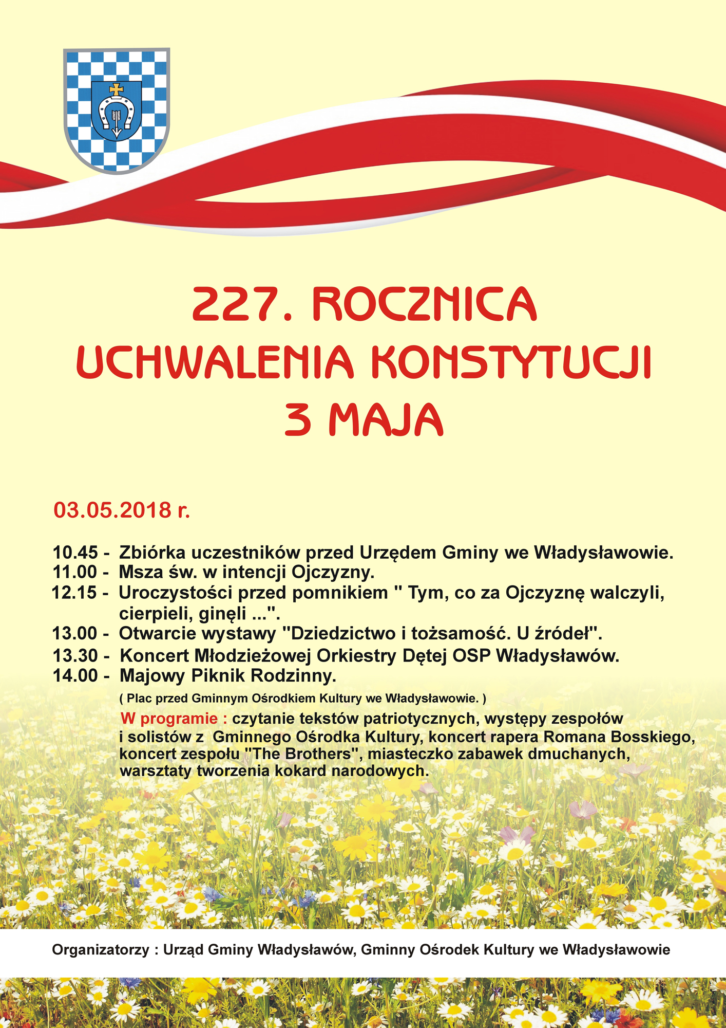 Czwartek 3 maja 2018 r. we Władysławowie to bardzo „zajęty dzień”. Oprócz uroczystości związanych z obchodami 227 rocznicy uchwalenia konstytucji 3 maja Gminny Ośrodek Kultury we Władysławowie zorganizował wiele atrakcji, które trafią do wszystkich i każdy znajdzie coś dla siebie. Zapraszamy na koncert zespołu The Brothers, który o 17:00 na Rynku we Władysławowie rozpocznie swój występ.