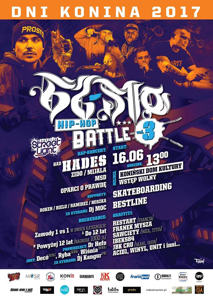 W jednym miejscu znajdziecie wszystkie elementy kultury hip hop: malowanie graffiti, koncerty rapu, zawody break dance połączone z 15-leciem grupy Body and Soul z KDK, streetowe jeżdżenie deskorolką. Specjalnie z tej okazji powstaje hip hopowy kawałek i teledysk Kuby Marszała. Konin będzie żył hip hopem, a gwiazdą będzie raper Hades.