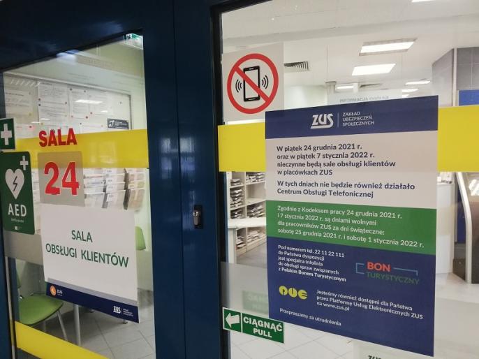 W piątek, 7 stycznia wszystkie placówki Zakładu Ubezpieczeń Społecznych oraz Centrum Obsługi Telefonicznej (COT) będą nieczynne. Tego dnia pracownicy ZUS odbiorą dzień wolny za dzień świąteczny – sobotę 1 stycznia 2022 roku. Do dyspozycji klientów będzie natomiast Platforma Usług Elektronicznych (PUE) ZUS oraz infolinia bonu turystycznego pod numerem telefonu 22 11 22 111 – informuje Krystyna Michałek, regionalny rzecznik prasowy ZUS województwa kujawsko-pomorskiego.