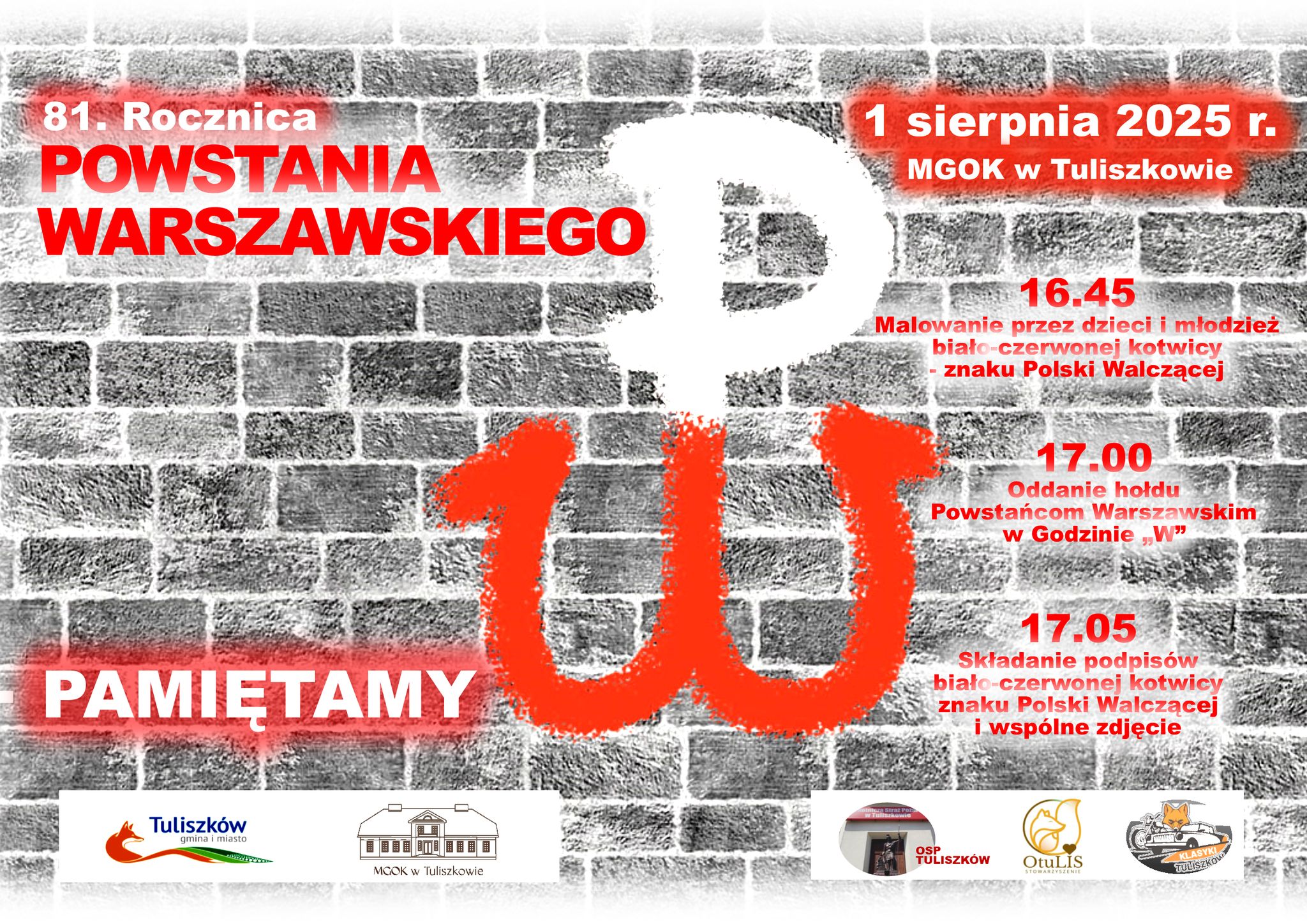 Przed budynkiem MGOK w Tuliszkowie odbędzie się upamiętnienie 81. rocznicy wybuchu Powstania Warszawskiego. Wydarzenie zaplanowano na czwartek, 1 sierpnia, o godzinie 16:45.