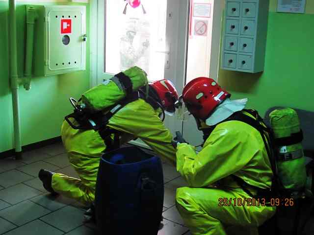 Zabezpieczeni w specjalistyczne ubrania chemiczne oraz wyposażeni w aparaty ochrony dróg oddechowych zlokalizowali substancję, którą była, jak się okazało woda amoniakalna. Po jej zabezpieczeniu ratownicy przekazali ją do utylizacji. W tym samym czasie, przeprowadzono ewakuację osób znajdujących się w budynku a poszkodowanym udzieloni pierwszej pomocy przedlekarskiej.