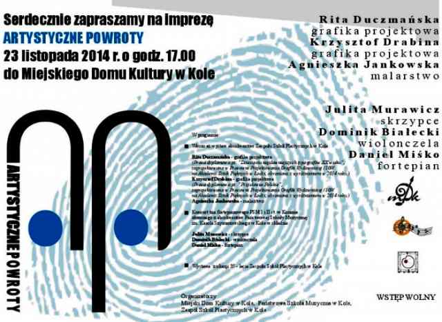 Organizatorami „Artystycznych powrotów” są Miejski Dom Kultury, Państwowa Szkoła Muzyczna oraz Zespół Szkół Plastycznych w Kole. IX edycja powrotów odbędzie się 23 listopada 2014 r. o godz. 17.00 w kolskim MDK. Wstęp będzie wolny.