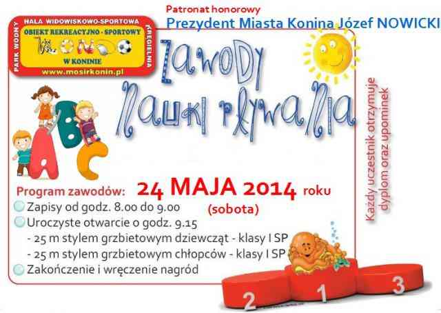 W najbliższą sobotę, 24 maja, odbędą się zawody podsumowujące tegoroczną edycję programu „ABC nauki pływania”. Wezmą w nim udział dzieci z klas pierwszych konińskich szkół podstawowych. Konkurencja zarówno dla dziewcząt jak i chłopców będzie jedna – to 25 metrów stylem grzbietowym.