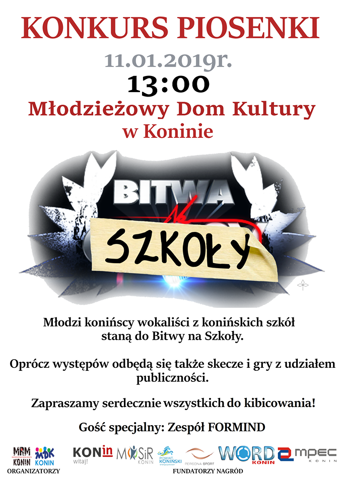 Młodzieżowy Dom Kultury zaprasza do kibicowania na publiczności Konkursu Piosenki pt. ,,Bitwa na Szkoły", gdzie młodzi wokaliści będą reprezentować swoją szkołę wykonując jeden utwór. Oprócz tego przewidujemy skecze i konkursy z udziałem publiczności.