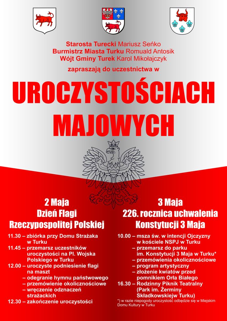 Obchody 226. rocznicy uchwalenia Konstytucji 3 Maja rozpoczną się mszą świętą w intencji Ojczyzny, odprawioną o godz. 10.00 w kościele NSPJ w Turku. Po nabożeństwie uczestnicy uroczystości przejdą do parku im. Konstytucji 3 Maja, gdzie zaplanowana została część patriotyczna. Wystąpienie okolicznościowe wygłoszą Burmistrz Turku i poseł na Sejm RP, Ryszard Bartosik, zaś uczniowie Gimnazjum nr 1 im. Lotnictwa Polskiego w Turku zaprezentują część artystyczną. Na zakończenie zebrani złożą kwiaty przy pomniku Orła Białego. Popołudniową część święta organizuje Miejski Dom Kultury, który już po raz XXV przeprowadzi Turkowskie Prezentacje Teatrów Ulicznych TURKOSTRADA. Prezentacje rozpoczną się o godz. 15.00 na parkingu przy klubie „Barbórka”. Następnie od 16.30 w dużym parku odbędzie się Rodzinny Piknik Teatralny. Na zakończenie dnia, o godz. 21.30 teatry będzie można oglądać ponownie na parkingu przy „Barbórce”.