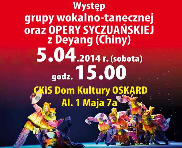 Dzień wcześniej na deskach Domu Kultury Oskard zaprezentują się artyści z Chin. O 15.00 rozpocznie się występ grupy wokalno-tanecznej oraz Opery Syczuańskiej z – z chińskiego miasta Deyang. Wstęp wolny – zarówno w sobotę jak i w niedzielę.