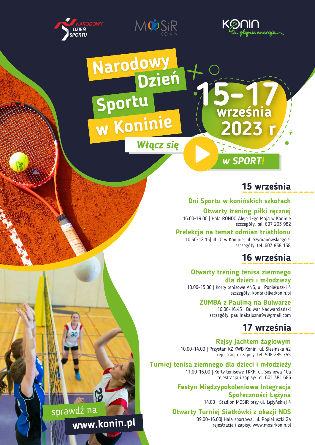 Ale to nie wszystko! W niedzielę w Koninie Towarzystwo Krzewienia Kultury Fizycznej Korty Konin organizuje turniej tenisa ziemnego dla dzieci i młodzieży. Będzie można wziąć udział w otwartym turnieju siatkówki, który odbędzie się przy ul. Popiełuszki 2a, natomiast Klub Żeglarski przy Kopalni Węgla Brunatnego „Konin” S. A. zaprasza na rejsy jachtem żaglowym. Na stadionie MOSiR przy ul. Łężyńskiej 4 odbędzie się festyn sportowo-rekreacyjny dla dzieci i dorosłych.