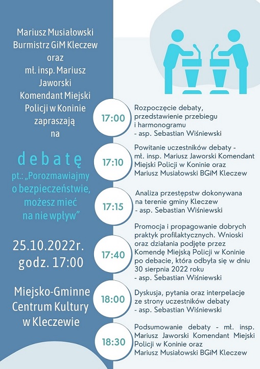 Burmistrz Gminy i Miasta Kleczew Mariusz Musiałowski oraz mł. insp. Mariusz Jaworski – Komendant Miejski Policji w Koninie zapraszają na debatę na temat bezpieczeństwa do Miejsko-Gminnego Centrum Kultury w Kleczewie.