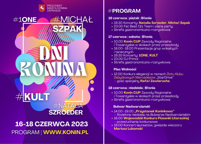 Natalia Szroeder, Michał Szpak, 1One i Kult to gwiazdy tegorocznych Dni Konina. Impreza odbędzie się od 16 – 18 czerwca. Towarzyszyć jej będą konkurs piosenki literackiej, zawody jeździeckie, zlot zabytkowych mercedesów, prezentacje lokalnych zespołów i rodzinne spotkanie na bulwarze. Nie zabraknie strefy gastronomiczno–rozrywkowej.