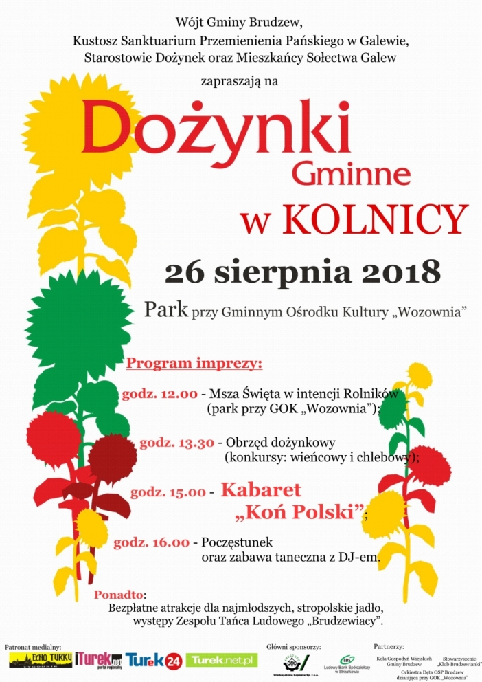 Wójt Gminy Brudzew, Kustosz Sanktuarium Przemienienia Pańsiego w Galewie, Starostowie Dożynek, Mieszkańcy Sołectwa Galew oraz Gminny Ośrodek Kultury „Wozownia” serdecznie zapraszają na Dożynki Gminne, które odbędą się 26 sierpnia 2018 roku w parku przy Gminnym Ośrodku Kultury „Wozownia” w Kolnicy.