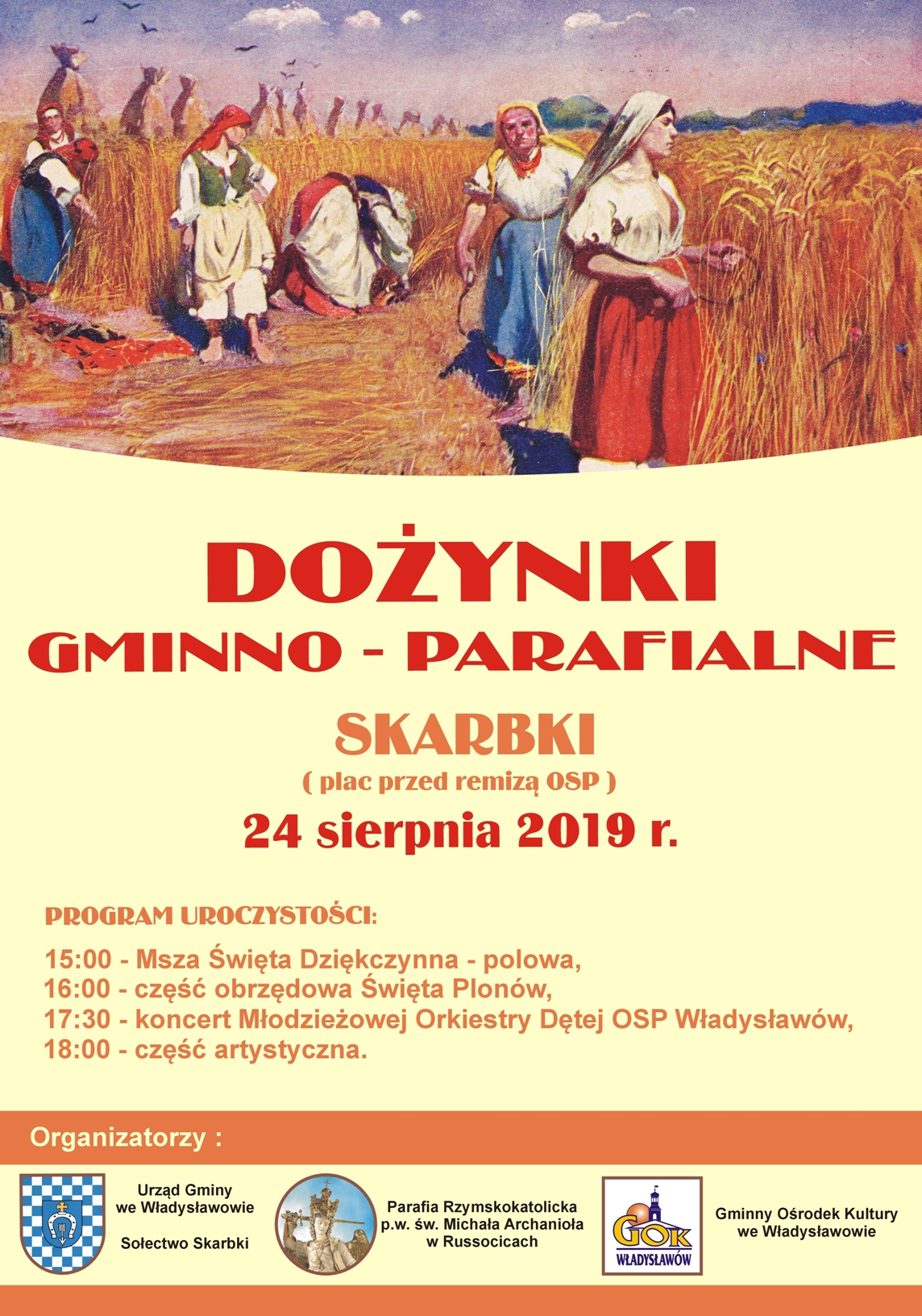 W związku z powyższym serdecznie zapraszamy na Dożynki Gminno-Parafialne, dn. 24 sierpnia 2019 r. godz. 15:00, plac przed remizą OSP w Skarbkach.