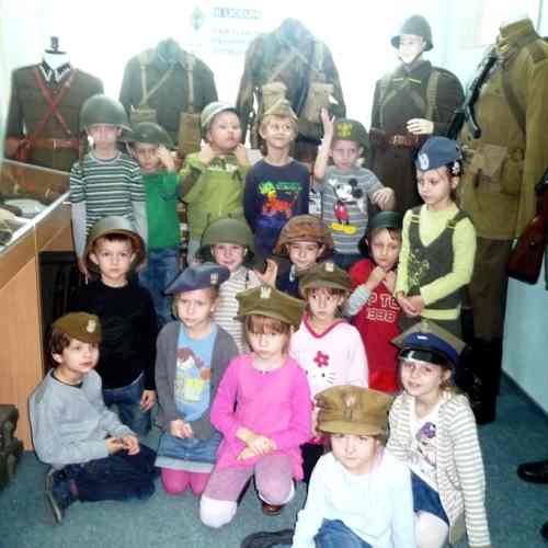 Dzieci z przedszkola nr 10 poznały elementy wyposażenia żołnierskiego. Maluchy z radością skorzystały z możliwości dotknięcia eksponatów. Spotkanie odbyło się w formie dialogu z grupą. Nie brakowało pytań oraz zagadek, które rozbudziły ciekawość przedszkolaków. Ostatnim punktem spotkania była sesja fotograficzna, podczas której dziewczynki wystąpiły w rogatywkach i furażerkach a chłopcy w hełmach.