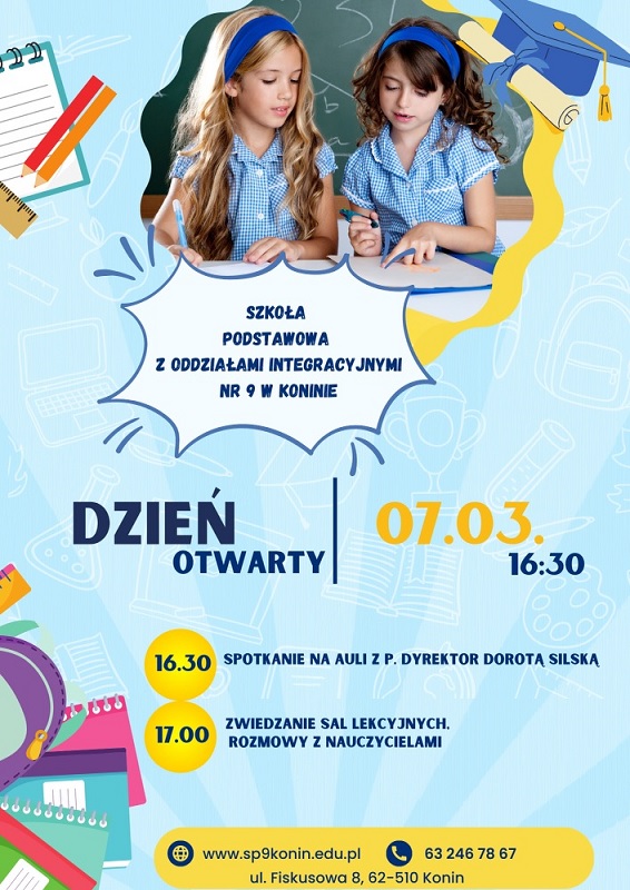 Dyrekcja wraz z gronem pedagogicznym serdecznie zapraszają na Dzień Otwarty w Szkole Podstawowej z Oddziałami Integracyjnymi nr 9 w Koninie dnia 07.03.2023 roku.