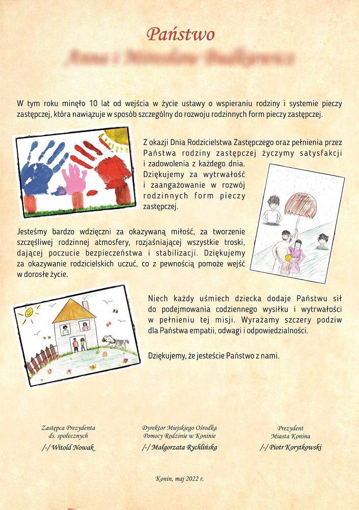 Zawodowe rodziny zastępcze i prowadzący Rodzinny Dom Dziecka uhonorowani zostali na scenie parkowego amfiteatru podczas „Zaczarowanego Dnia Dziecka” (29 maja). Natomiast do 59 spokrewnionych rodzin zastępczych (np. babcie, dziadkowie), w których przebywa 79 dzieci i do 14 niezawodowych rodzin zastępczych (np. ciocie, wujkowie) – 22 dzieci, pisemne podziękowania dostarczyli koordynatorzy rodzinnej pieczy zastępczej Miejskiego Ośrodka Pomocy Rodzinie w Koninie.