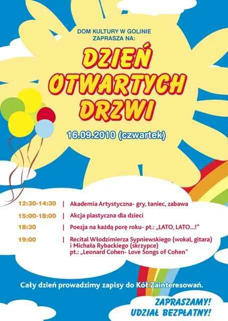 Dom Kultury w Golinie zaprasza w czwartek 16 września na drzwi otwarte. Wydarzeniu towarzyszyć będzie artystyczna akademia (gry, zabawy i taniec), akcja plastyczna dla dzieci, poezja i recital muzyków.Wszystko rozpocznie się o godz. 12:30 Akademią Artystyczną. Na zakończenie, o 19:00, z recitalem zatytułowanym „Leonard Cohen – Love Songs of Cohen”, wystąpią: Włodzimierz Sypniewski (wokal, gitara) i Michał Rybacki (skrzypce). Przez cały dzień prowadzone będą zapisy do wszystkich kół zainteresowań, działających w golińskim Domu Kultury. Udział w wydarzeniu jest oczywiście bezpłatny.