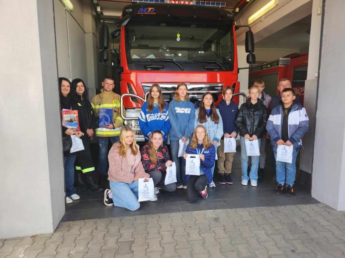 Uczniowie klasy VIII Zespołu Szkolno Przeszkolnego im. Romualda Traugutta w Grzymiszewie, w ramach lekcji z edukacji dla bezpieczeństwa, odwiedzili dziś jednostkę Ochotniczej Straży Pożarnej w Grzymiszewie.