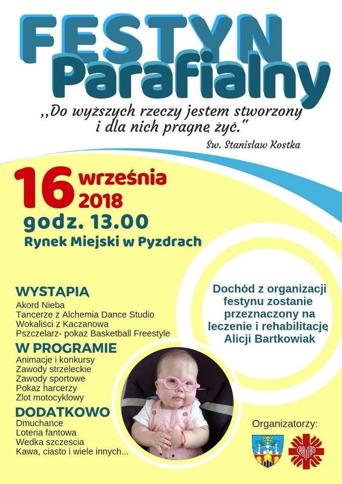 Serdecznie zapraszamy Państwa do wzięcia udziału w Festynie Parafialnym, który odbędzie się 17 września na przystani wodniackiej w Pyzdrach. Zachęcamy do zapoznania się z programem tej imprezy. Dochód z jej organizacji zostanie przeznaczony na leczenie 21-letniego mieszkańca Pyzdr.