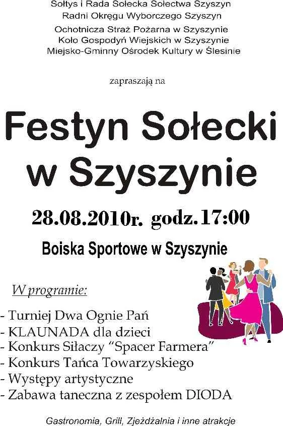 Turniej „Dwa ognie pań”, klaunada dla dzieci, konkurs siłaczy „spacer farmera”, konkurs tańca towarzyskiego, występy artystyczne i zabawa taneczna z zespołem „Dioda” – to wszystko już dziś w Szyszynie w gminie Ślesin. Impreza rozpocznie się o godz. 17:00 na miejscowym boisku sportowym.Na Festyn Sołecki w Szyszynie zapraszają: Sołtys i Rada Sołecka Sołectwa Szyszyn, Radni Okręgu Wyborczego, Ochotnicza Straż Pożarna, Koło Gospodyń Wiejskich oraz Miejsko-Gminny Ośrodek Kultury w Ślesinie.