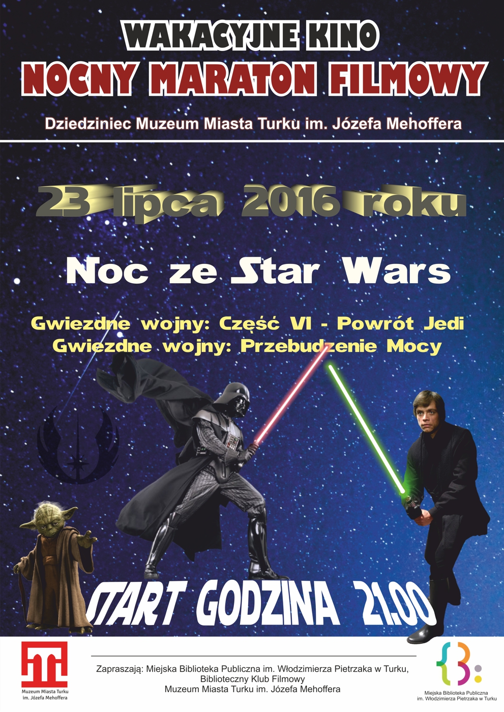 Wzorem lat ubiegłych spotykamy się na dziedzińcu muzeum i ruszamy już 23 lipca (godz. 21.00) w międzygalaktyczną podróż z bohaterami sagi „Gwiezdnych Wojen”. Tym razem zaprezentujemy część VI „Powrót Jedi” i część VII – „Mroczne widmo”. Dobra zabawa gwarantowana.