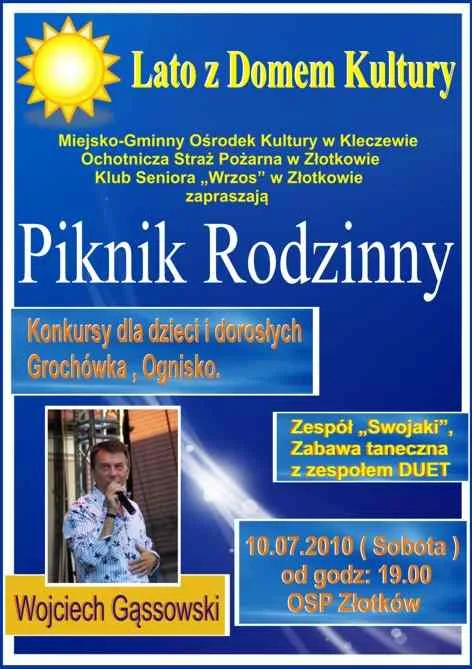 Wojciech Gąssowski wystąpi podczas pikniku rodzinnego w Złotkowie (gmina Kleczew). Oprócz tego konkursy dla dzieci i dorosłych, grochówka oraz ognisko. Na scenie pojawi się również grupa „Swojaki”, a piknik zakończy zabawa taneczna z zespołem „Duet”.Piknik rodzinny przy remizie Ochotniczej Straży Pożarnej w Złotkowie już w sobotę 10 lipca o godzinie 19:00. Na imprezę zaprasza Miejsko-Gminny Ośrodek Kultury, OSP i Klub Seniora „Wrzos”.
