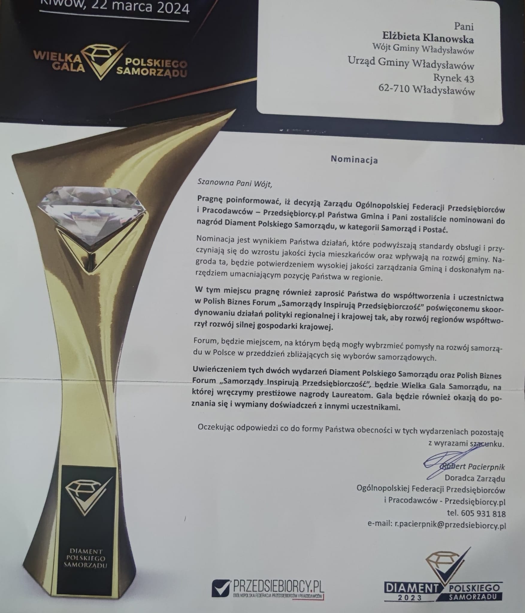 Gmina Władysławów i jej Wójt, Elżbieta Klanowska, z dumą ogłaszają otrzymanie nominacji do prestiżowej nagrody "Diament Polskiego Samorządu" w ramach programu Sylwetki i Marki Polskiego Samorządu.