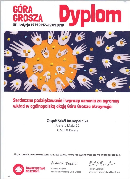 Akcja ma na celu pomoc dzieciom, które z różnych powodów nie mogą wychowywać się w swoich biologicznych rodzinach. Swoim udziałem w akcji udowadniamy, że chcemy pomagać i każda, nawet najmniejsza moneta ma znaczenie. Kwota jaką zebraliśmy wspólnie to 354,38 zł. Największą sumę pieniędzy zebrała klasa III c, było to aż 116, 42zł, na drugim miejscu znalazła się klasa Vb z kwotą 53,33 zł, niemałą kwotę zebrała też klasa IVa-36, 36 zł. Samorząd Uczniowski, który koordynował akcję w naszej szkole dziękuje wszystkim uczniom i wychowawcom za zaangażowanie i wkład włożony w przeprowadzenie zbiórki.