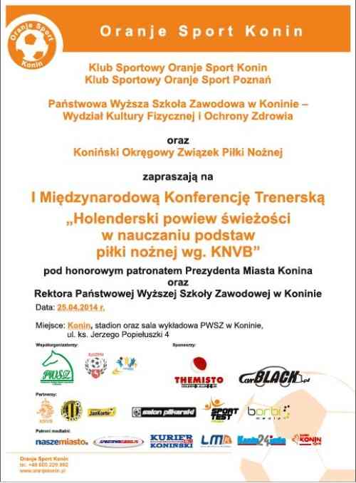 „Holenderski powiew świeżości w nauczaniu piłki nożnej wg KNVB” – pod takim hasłem przebiegnie zaplanowana na 25 kwietnia I Międzynarodowa Konferencja Trenerska, która odbędzie się w auli konińskiej PWSZ.