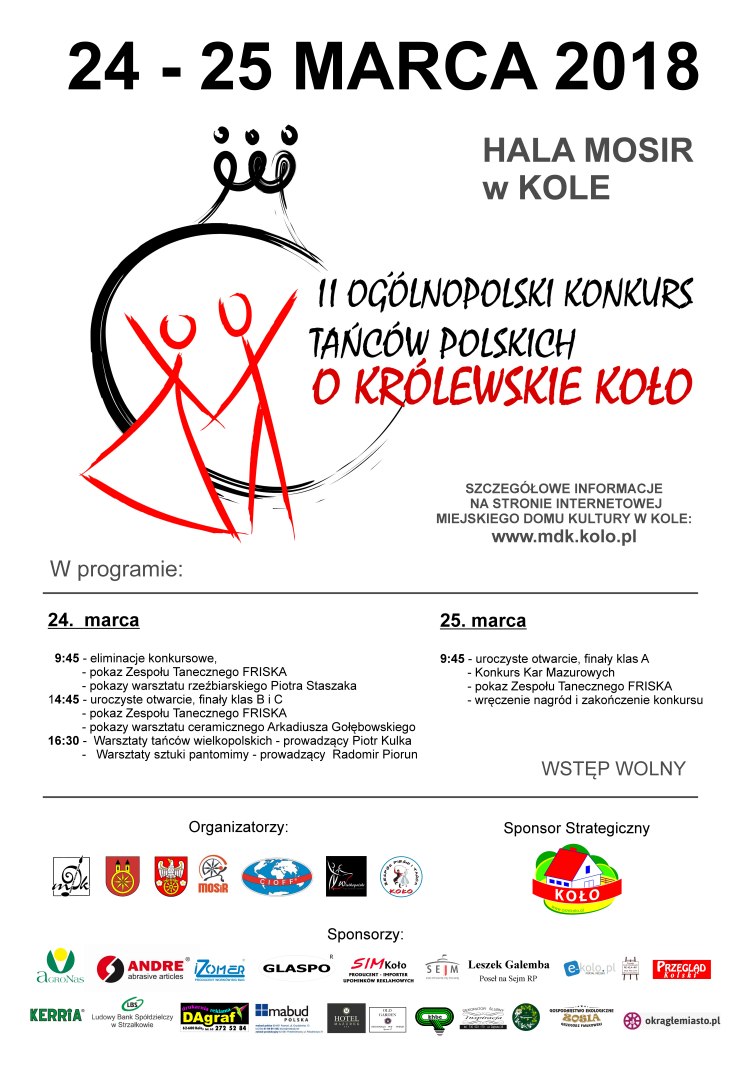 Miejski Dom Kultury w Kole zaprasza do udziału w II Ogólnopolskim Konkursie Tańców Polskich "O Królewskie Koło", który odbędzie się w dniach 24-25 marca 2018 r. w hali MOSiR w Kole.