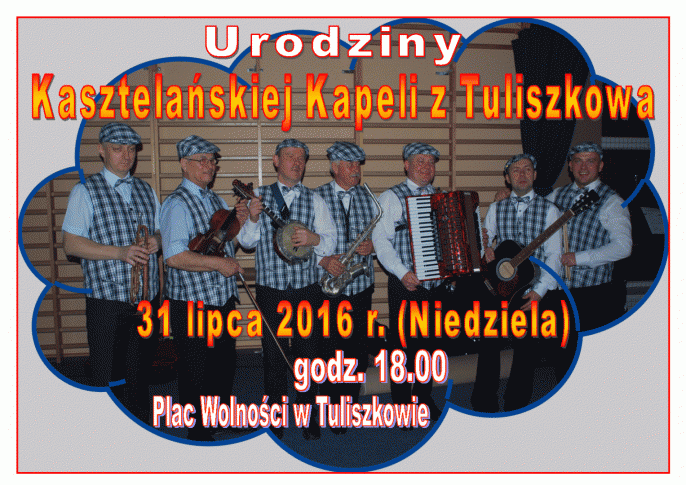 Serdecznie zapraszamy na II Urodziny Kasztelańskiej Kapeli z Tuliszkowa. Impreza o charakterze muzycznym odbędzie się 31 lipca 2016 roku (niedziela) o godz. 18:00 na Placu Wolności w Tuliszkowie.