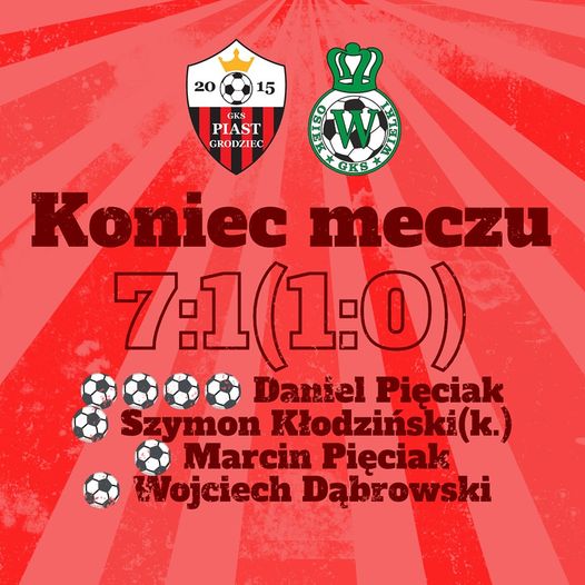 Druga połowa zaczęła się po myśli GKS-u, bo już w pierwszej akcji sędzia ogwizdał rzut karny dla drużyny, który na bramkę pewnie zamienił Szymon Kłodziński. Następnie otworzył się przysłowiowy worek z bramkami a do bramki jeszcze trzykrotnie trafił Daniel Pięciak, po jednym trafienieu zanotowali Marcin Pięciak i Wojciech Dąbrowski. Niestety, nie udało się zachować czystego konta po tym jak z dystansu honorową bramkę zdobyli goście. Okazałe zwycięstwo przyniosło pozycję lidera, warto zaznaczyć , że to pierwszy raz w historii występów w A klasie. Za tydzień zespół GKS Piast Grodziec czeka wyjazd do Przedcza.