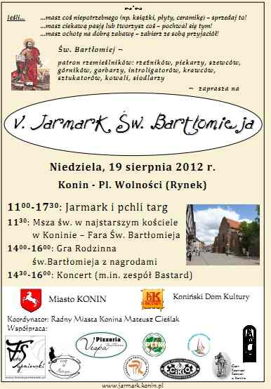 Jarmark z grą rodzinną AktualnościKoninKultura 09/08/2012 Mniej niż 1 min. FacebookTwitterWhatsApp MASZ WAŻNĄ WIADOMOŚĆ? Prześlij do naszej redakcji zdjęcie, film, lub informację! +48 63 242 01 01 Jest patronem rzemieślników. Niebawem przypada jego święto. Z tej okazji na konińskiej starówce odbędzie się jarmark noszący jego imię. Mowa o świętym Bartłomieju, który 19 sierpnia po raz piąty patronować będzie niecodziennemu wydarzeniu. Co w programie imprezy? PROMOCJA Fundusze EuropejskieFundusze Europejskie wspierają rozwój wielkopolskich wsiRedakcja LP - 03/11/20250BiznesAsona Energy ogłasza inwestycję w krematorium w Koninie!Redakcja LP - 31/10/20250AktualnościUczennica Państwowej Szkoły Muzycznej w Koninie z prestiżowym stypendium Ministra Kultury!Redakcja - 31/10/20250Wydarzenia„Dzieciństwo bez przemocy” Konin włącza się w ogólnopolską kampanię.Redakcja LP - 29/10/20250KulturaStypendia Prezydenta Miasta Konina w dziedzinie kulturyRedakcja LP - 28/10/20250 PROMOCJA Fundusze EuropejskieFundusze Europejskie wspierają rozwój wielkopolskich wsiRedakcja LP - 03/11/20250BiznesAsona Energy ogłasza inwestycję w krematorium w Koninie!Redakcja LP - 31/10/20250AktualnościUczennica Państwowej Szkoły Muzycznej w Koninie z prestiżowym stypendium Ministra Kultury!Redakcja - 31/10/20250Wydarzenia„Dzieciństwo bez przemocy” Konin włącza się w ogólnopolską kampanię.Redakcja LP - 29/10/20250KulturaStypendia Prezydenta Miasta Konina w dziedzinie kulturyRedakcja LP - 28/10/20250 Szukaj Konin pochmurnie enter location 11.7 ° C 11.7 ° 11.7 ° 68 % 5.7kmh 19 % pt. 12 ° sob. 13 ° niedz. 11 ° pon. 10 ° wt. 11 ° Sygnał24INFO Urząd Gminy i GOPS w Rzgowie będą nieczynne 10 listopada 07/11/2025 Utrudnienia w ruchu w miejscowości Natalia – rusza remont drogi powiatowej 06/11/2025 Po alkoholu stracił orientację w lesie. Służby odnalazły go całego i zdrowego 06/11/2025 Szkolenie w Urzędzie Miejskim w Sompolnie – czasowe ograniczenia w obsłudze interesantów 06/11/2025 Strażnicy miejscy patrolowali trudno dostępne rejony Konina 06/11/2025 Poprzedni artykułMuzycznie na bulwarzeNastępny artykułKradli studzienki kanalizacyjne Mogłeś przegapić Narodowe Święto Niepodległości w Gminie Rzgów – wspólne świętowanie 11 listopada Rzgów 07/11/2025 Konkurs Wiedzy o Bezpieczeństwie w Ruchu Drogowym w Lubstowie Aktualności 07/11/2025 Policjanci z Konina o bezpieczeństwie najmłodszych w Przedszkolu w Brzeźnie Aktualności 07/11/2025