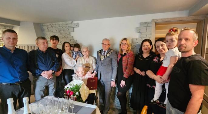 Z tej okazji dostojną Jubilatkę odwiedzili przedstawiciele rychwalskiego samorządu. Burmistrz Stefan Dziamara, Zastępczyni Burmistrza Ewa Jędrzejczak oraz Kierownik USC Beata Lewandowska w imieniu własnym oraz całej społeczności gminy przekazali na ręce Pani Anny list gratulacyjny z kwiatami i upominkiem oraz życzenia zdrowia, pogody ducha oraz wielu szczęśliwych chwil w gronie najbliższych
