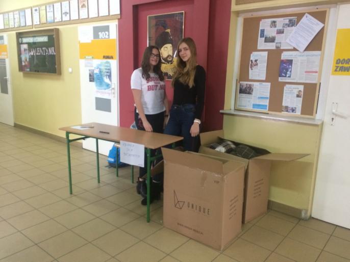 Dziewczyny z Klubu Młodego Ekonomisty przeprowadziły zbiórkę dla bezdomnych – podopiecznych Fundacji Sercem Przyprawionej. Zbierały kubki termiczne, kurtki, czapki i szaliki, a także artykuły spożywcze – herbatę, cukier, miód i konserwy. Uczennice klasy 2 E, wraz z opiekunem , jeszcze tego samego dnia przekazały zebrane rzeczy do Jadłodzielni przy ul. 3 Maja.