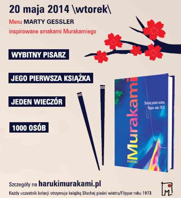 W menu, przygotowanym specjalnie na tę okazję przez Martę Gessler, znajdą się takie dania, jak „Spadająca rybka Kafki Tamury” czy „Zupa Lżej-Na-Sercu”. Wszystkie zostały zainspirowane postaciami, fabułą i atmosferą książek japońskiego pisarza. Goście wydarzenia otrzymają przedpremierowo najnowszą powieść Harukiego Murakamiego „Słuchaj pieśni wiatru / Flipper roku 1973”.