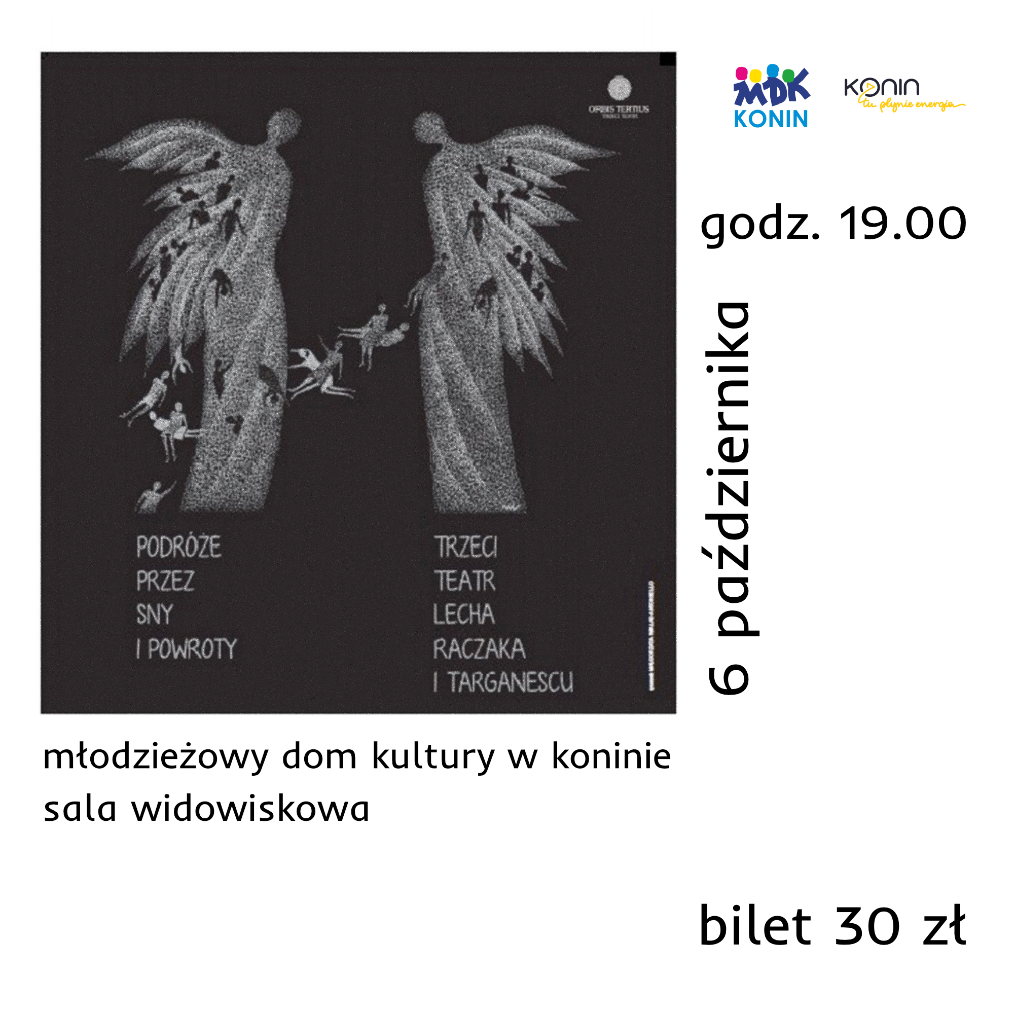 Młodzieżowy Dom Kultury w Koninie zaprasza na niezwykły spektakl ,,Podróże przez sny i powroty” w wykonaniu Trzeciego Teatru Lecha Raczaka i Trio Targanescu. 6 października, godz. 19.