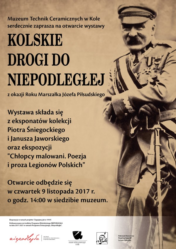 Z okazji Roku Marszałka Józefa Piłsudskiego oraz zbliżającego się Narodowego Święta Niepodległości w Muzeum Technik Ceramicznych w Kole można obejrzeć wystawę "Kolskie drogi do Niepodległej" składającą się z ekspozycji kolekcjonerów Piotra Śniegockiego i Janusza Jaworskiego, zbiorów własnych muzeum oraz wystawy – "Chłopcy malowani. Poezja i proza Legionów Polskich". Wystawa odbywa się w ramach projektu "Zagrajmy jak w 1918", została dofinansowana ze środków Programu Wieloletniego NIEPODLEGŁA na lata 2017-2021 w ramach Programu Dotacyjnego „Niepodległa” i będzie czynna do końca stycznia 2018 r.