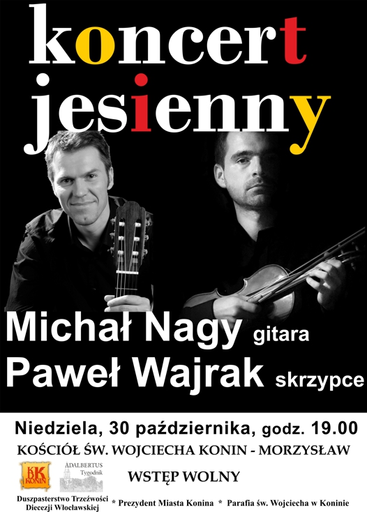 Jeszcze przed IX edycją Tryptyku zaduszkowego „ Nie wszystek umrę…”, w niedzielę, 30 października o godz. 19.00, odbędzie się Koncert Jesienny na gitarę i skrzypce. W październiku zaproszenie do kościoła św. Wojciecha przyjęli gitarzysta klasyczny Michał Nagy i skrzypek Paweł Wajrak – znakomici muzycy z imponującym dorobkiem! Artyści przygotowali specjalny program, który wprowadzi nas w klimat zarówno Wszystkich Świętych jak i Zaduszek.