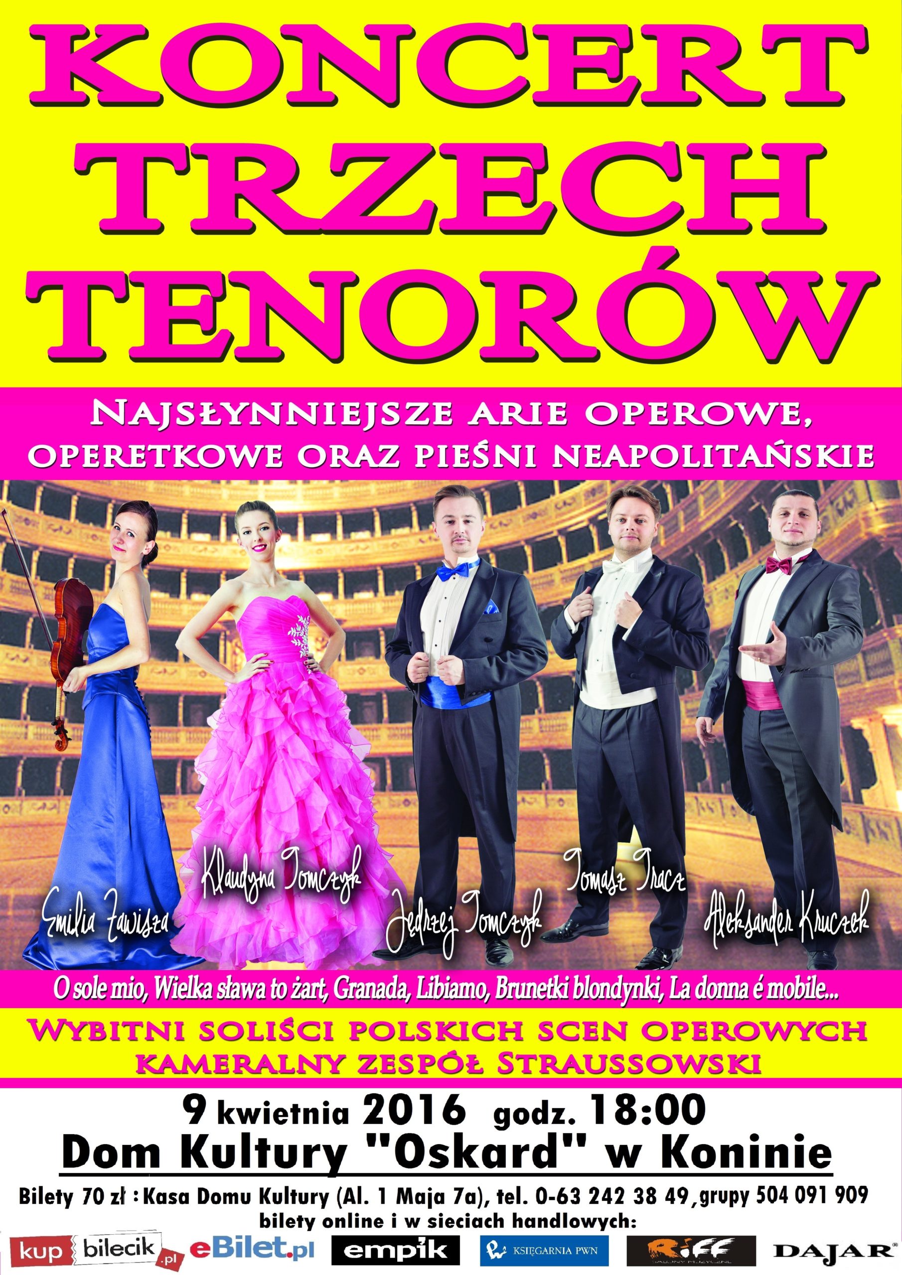Zapraszamy Państwa serdecznie na Koncert Trzech Tenorów, który programowo nawiązywać będzie do Gali z udziałem trzech największych tenorów świata. Podczas koncertu usłyszą Państwo obdarzonych wspaniałymi głosami, fantastycznych śpiewaków operowych, solistów polskich i europejskich scen muzycznych, wystąpią trzej znakomici tenorzy młodego pokolenia – Jędrzej Tomczyk, Tomasz Tracz oraz Aleksander Kruczek. Towarzyszyć im będą wybitni, polscy kameraliści młodego pokolenia, występujący na co dzień z najlepszymi orkiestrami i dyrygentami w Polsce i Europie. Tej gali nie można przegapić, na scenie pojawią się laureaci międzynarodowych konkursów muzycznych, wirtuozi skrzypiec, fortepianu, wspaniali soliści polskiej estrady. Zabrzmią największe przeboje opery i operetki, przepiękne pieśni neapolitańskie i szlagiery literatury skrzypcowej, wspaniałe światowe arie największych kompozytorów. Publiczność usłyszy m.in.: O sole mio, Granadę, Brunetki blondynki, Arię Barinkaya "Wielka sława to żart", Arię Księcia "La donna é mobile,