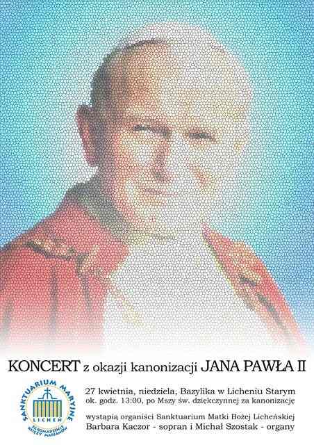 kwietnia. Muzykowanie w licheńskiej bazylice na organach noszących imię papieża Jana Pawła II rozpocznie się ok. godz. 13.00 po mszy św. dziękczynnej za kanonizację papieża-Polaka. W koncercie wystąpią: Barbara Kaczor (sopran) oraz Michał Szostak (organy) – organiści pracujący w Sanktuarium Maryjnym w Licheniu Starym.