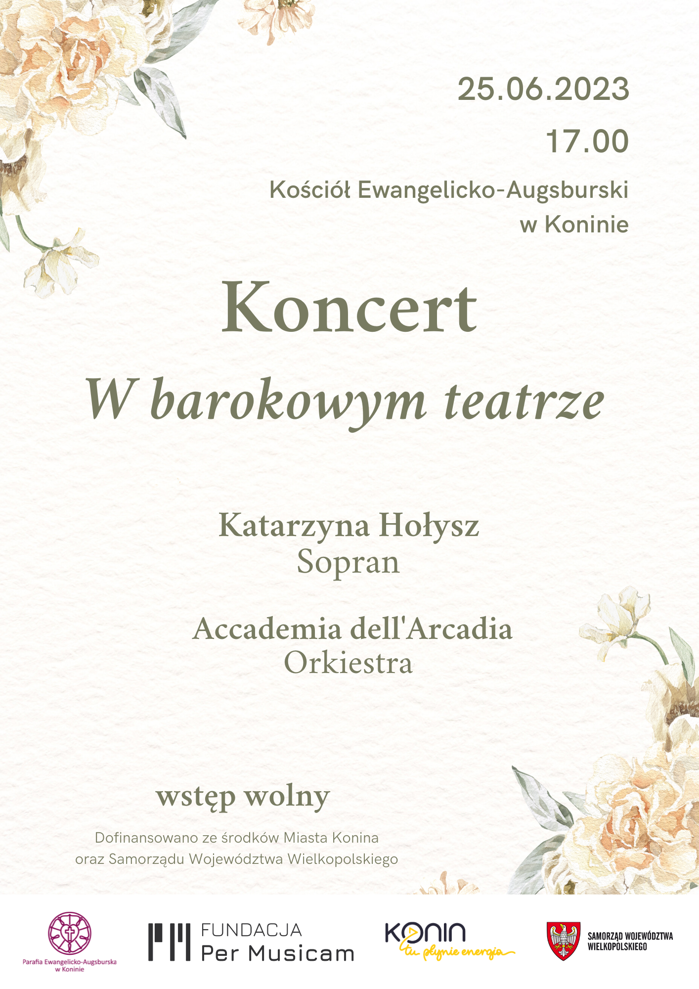 Parafia Ewangelicko-Augsburska w Koninie i Fundacja Per Musicam mają zaszczyt zaprosić na koncert "W Barokowym Teatrze", który odbędzie się 25.06.2023 o 17.00 w Kościele Ewangelicko-Augsburskim w Koninie.