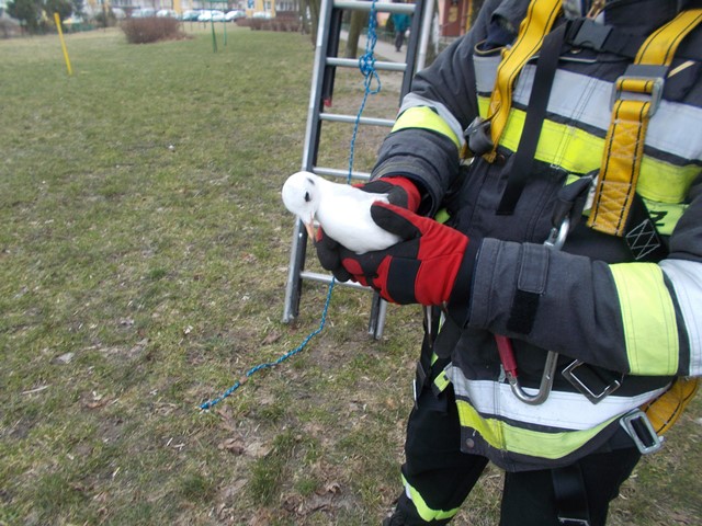 Działania strażaków polegały na dotarciu do uwięzionego ptaka przy użyciu drabiny, którego następnie przekazano funkcjonariuszom Straży Miejskiej.