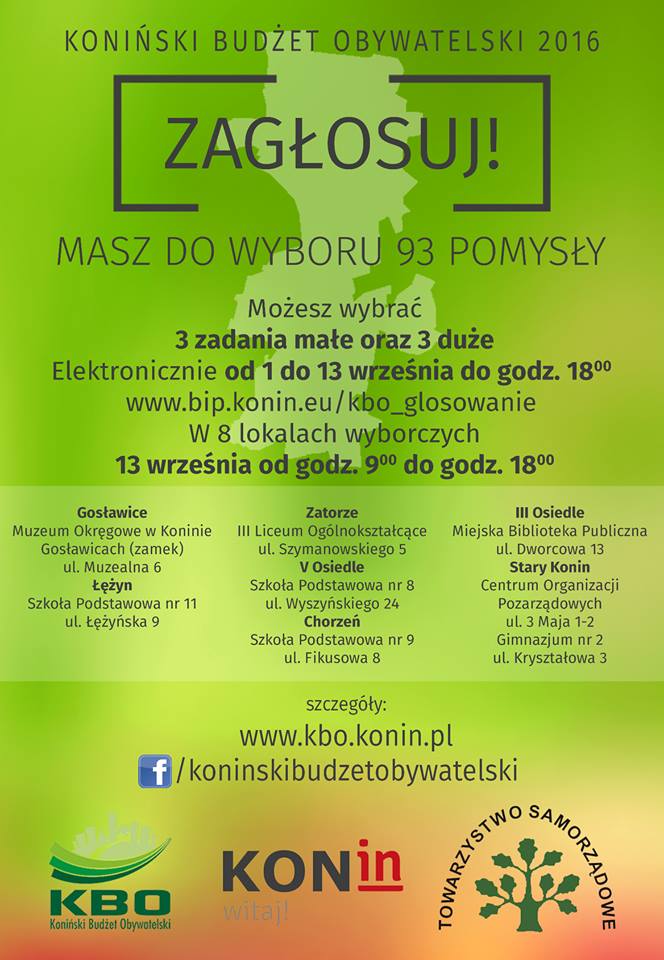 Przed nami trzecia edycja Konińskiego Budżetu Obywatelskiego. Mieszkańcy Konina, zgodnie z definicją zawartą w Regulaminie KBO, mogą w bardzo prosty sposób oddać swoje głosy zarówno w głosowaniu internetowym jak i tradycyjnie, poprzez udanie się do lokalu wyborczego.