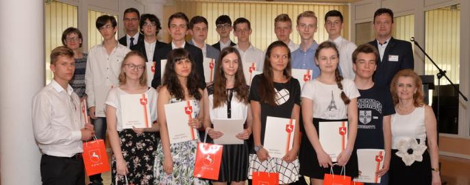 W poniedziałek (29 maja) w sali sesyjnej konińskiego ratusza odbyła się uroczystość, na której spotkali się Zastępca Prezydenta Konina Sławomir Lorek oraz Kierownik Wydziału Oświaty UM Urszula Miłosz-Michalkiewicz z uczniami konińskich gimnazjów – laureatami wojewódzkich konkursów przedmiotowych.