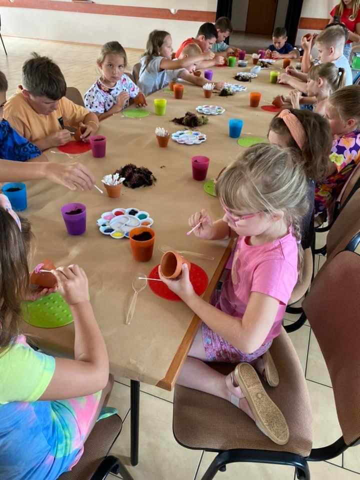 Na warsztatach plastycznych dzieci tworzyły breloczki, bransoletki, naszyjniki oraz uczestniczyły w warsztatach ekologicznych, podczas których zdobiły doniczki i sadziły rośliny. Dodatkowo, nauczyły się techniki tworzenia papierowej wikliny oraz ozdób z niej.