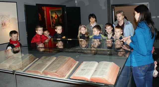 Ciekawość wśród uczniów wzbudził też dotykowy panel multimedialny, dzięki któremu można zapoznać się ze skanami starodruków znajdujących się w muzeum, m.in. bibliami Jakuba Wujka, Leopolity oraz Brzeską datowanymi na XVI wiek. Dzieci z uwagą słuchały opowiadań pani przewodnik, która w obrazowy sposób przedstawiała historię poszczególnych eksponatów.