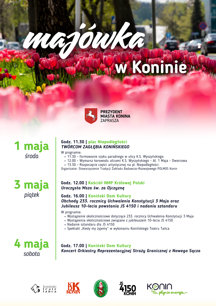 Natomiast 4 maja o godzinie 17:00 w Konińskim Domu Kultury rozpocznie się koncert Orkiestry Reprezentacyjnej Straży Granicznej z Nowego Sącza. Podczas tego wydarzenia zabrzmią pieśni patriotyczne, muzyka rozrywkowa, a także tradycyjne góralskie melodie. Na koncert obowiązują wejściówki.