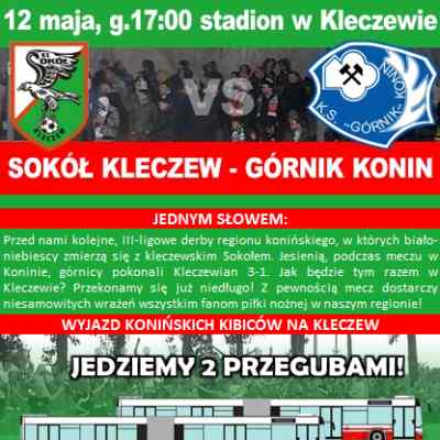 KS Górnik Konin wraz ze Stowarzyszeniem Sympatyków Konińskiego Górnika organizuje zbiorowy wyjazd na mecz z Sokołem w Kleczewie. Przez miasto przejadą dwa autobusy przegubowe, które zabiorą fanów „biało-niebieskich”. Koszt przejazdu w obie strony to 8 złotych. Dokładne trasy wraz z godzinami odjazdów z kolejnych przystanków podane są na stronie internetowej SSKG – www.kibicegornika.lm.pl oraz poniżej. Uwaga! Pierwszych dwustu kibiców, którzy wejdą do autobusów otrzyma pamiątkowe koszulki z emblematami Górnika Konin!