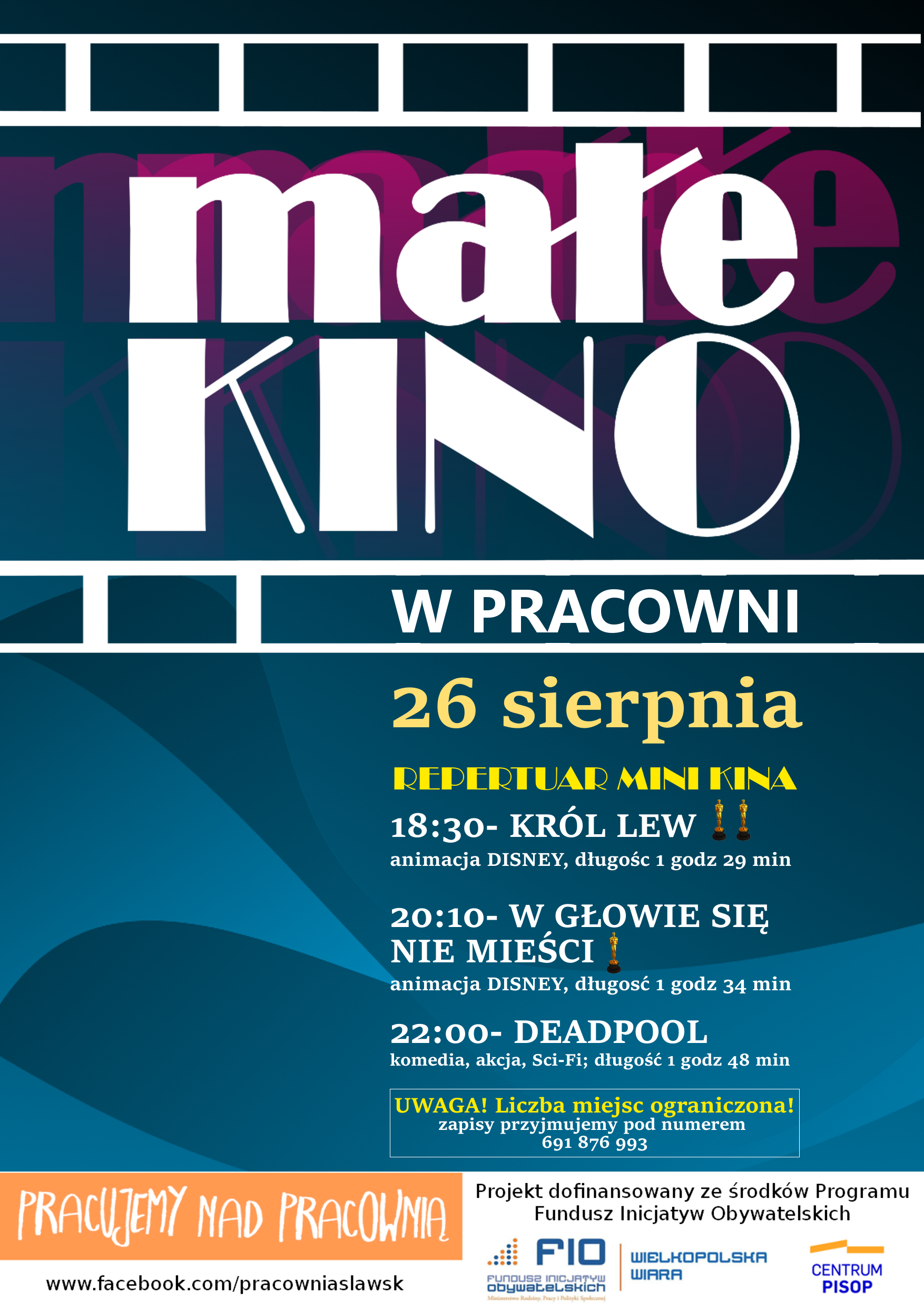 W ramach projektu odbyły się spotkania w ramach prac nad strategią rozwoju naszego stowarzyszenia, a także wyposażyliśmy Pracownię w nowe sprzęty dzięki którym możliwe będzie zorganizowanie seansu kina. Będzię on przysłowiową "wisienką na torcie" i zwieńczeniem naszych miesięcznych wysiłków. Całość rozpocznie się 26 sierpnia o godzinie 18:00 w siedzibie stowarzyszenia (Sławsk 51, pomieszczenie na piętrze). W ramach kina odbędzie się projekcja 3 filmów: "Król Lew", "W Głowie się nie Mieści" oraz "Deadpool".