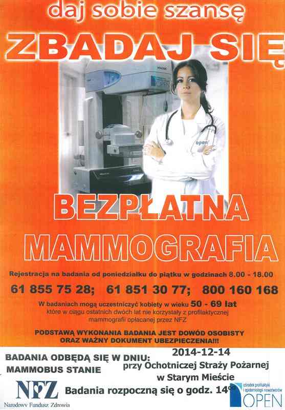 Bezpłatne badania mammograficzne zostaną przeprowadzone 7 marca w Starym Mieście. Będą one skierowane dla kobiet w wieku od 50 do 69 lat, które w ciągu ostatnich dwóch lat nie korzystały z profilaktycznej mammografii opłacanej przez NFZ. Badania będą prowadzone od godz. 9:00 w ambulansie medycznym, który stanie na parkingu przy Urzędzie Gminy w Starym Mieście.