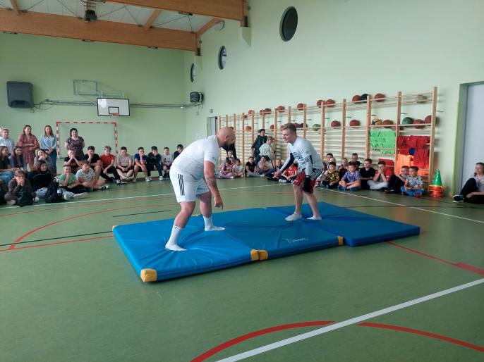 Razem z nauczycielem szkoły Piotrem Paszkiem zostały zaprezentowane zarówno techniki stójkowe, jak i parterowe.